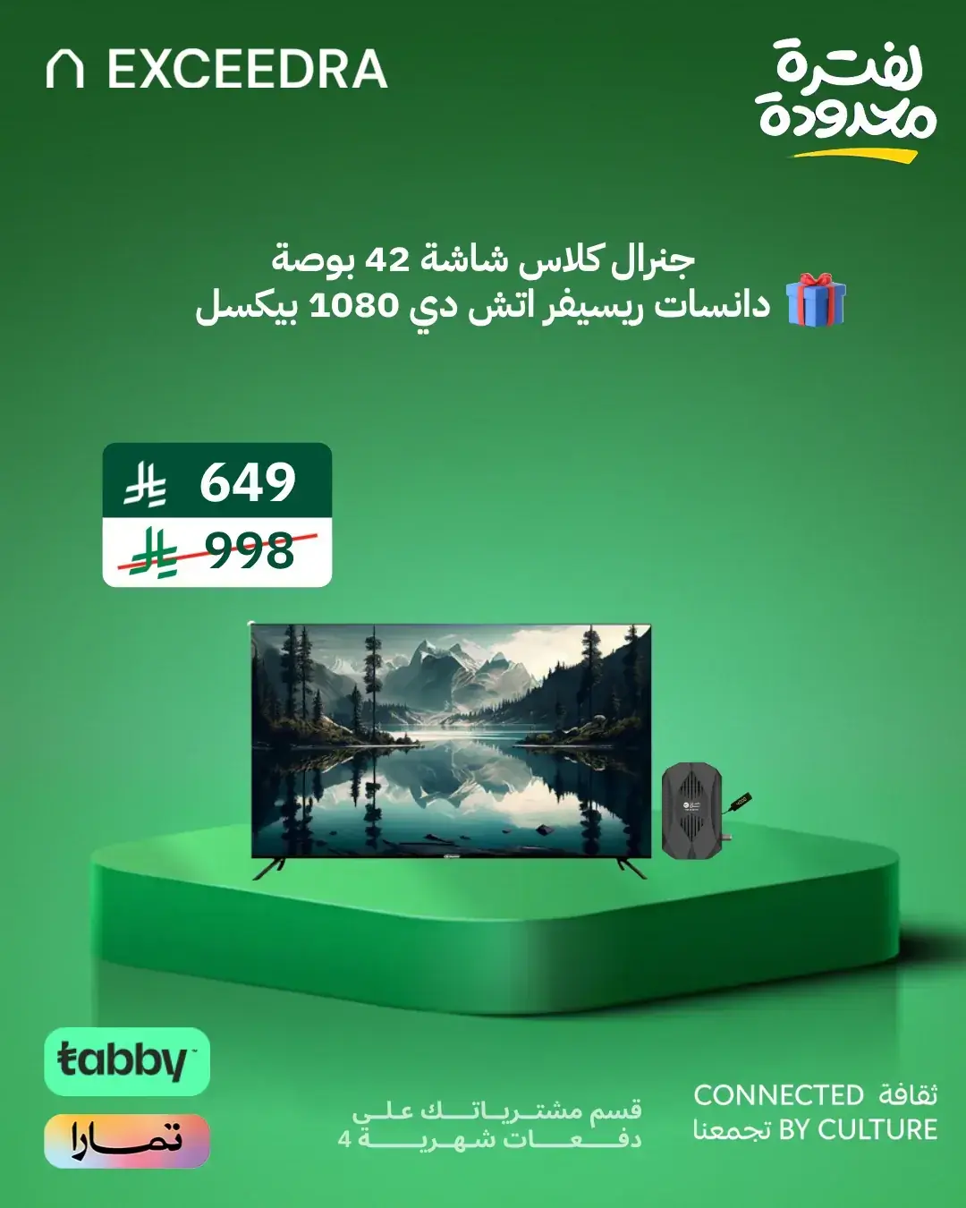 جنرال كلاس شاشة تلفزيون 42 بوصة بدون اطار- ليد جوده عالية الوضوح فول اتش دي – مدخلين يو اس بي و 3 مداخل اتش دي – سماعتين * 8 وات – 42US6000 + جهاز استقبال القنوات الرقمية عالية الدقة