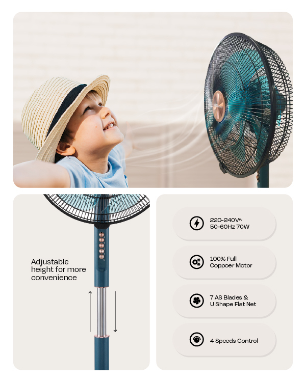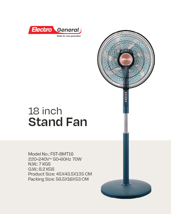 احصل على راحة تبريد مثالية مع مروحة ستاند الكترو جنرال موديل FST-BMT16، المصممة لتوفير تدفق هواء واسع وهادئ مع أداء عالي الكفاءة. تحتوي المروحة على محرك نحاسي بالكامل (74*16 مم) لضمان المتانة والقوة، و 7 شفرات من مادة AS التي تقدم تهوية قوية وفعّالة